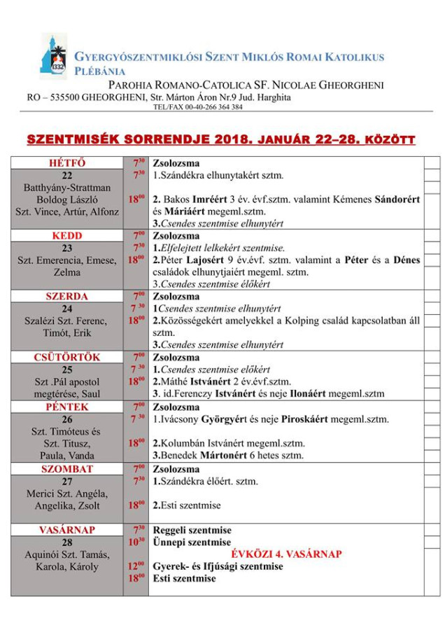 2018. FEBRUÁR 25– MÁRCIUS 4. közötti miserend: