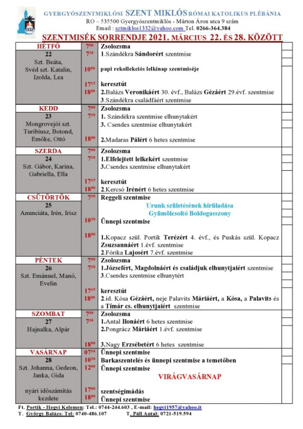 • Szeretettel köszöntjük azokat, akik a jövő héten születés-, névnapjukat vagy házassági évfordulójukat ünneplik. A jó Isten áldását és segítségét kérjük számukra. Mindannyiuknak kívánunk a feltámadt Jézustól áldott, örömteli húsvéti napokat.