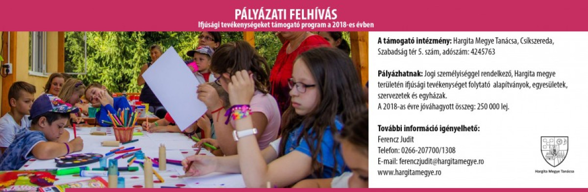 Meghirdette pályázati programjait Hargita Megye Tanácsa, köztük az ifjúsági tevékenységeket támogató kiírásokat is. 2018-at az ifjúság évének nyilvánította Hargita Megye Tanácsa, ennek jegyében még nagyobb hangsúlyt fektetnek a fiatalok segítésére, képzéseik, oktató és szórakoztató programjaik támogatására, ezért a megyei tanács az ifjúsági tevékenységeket támogató pályázatok keretösszegét megemelte 250 ezer lejre. Pályázni lehet erdei iskola programokra, képzések, táborok szervezésére, didaktikai eszközök beszerzésére. A programokon belül nagy hangsúlyt fektetnek az erdei iskola programra, a terv az, hogy a program mozgalommá nője ki magát, hiszen ez az a tevékenység, amely kiviszi a gyerekeket, a fiatalokat a szabadba, és emellett szerteágazó gyakorlati tudással gazdagodnak. A kiírás meghirdetéséről szóló videó megtekinthető az alábbi linken: