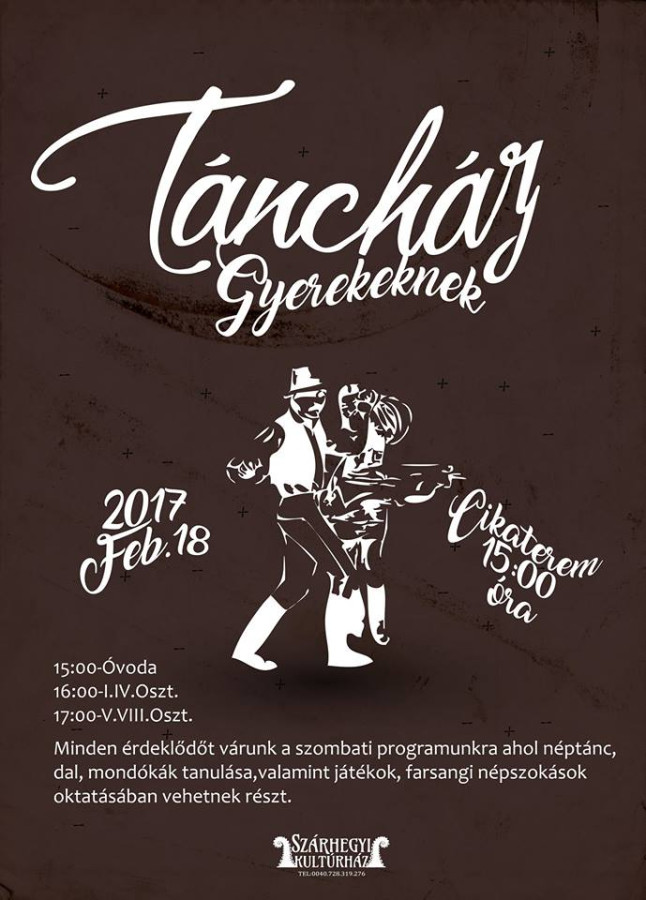 Minden érdeklődőt várunk a Táncház Gyerekeknek című szombati programunkra, ahol néptáncok, dalok, mondókák tanulásában,valamint játékok, farsangi népszokások oktatásában vehetnek részt.