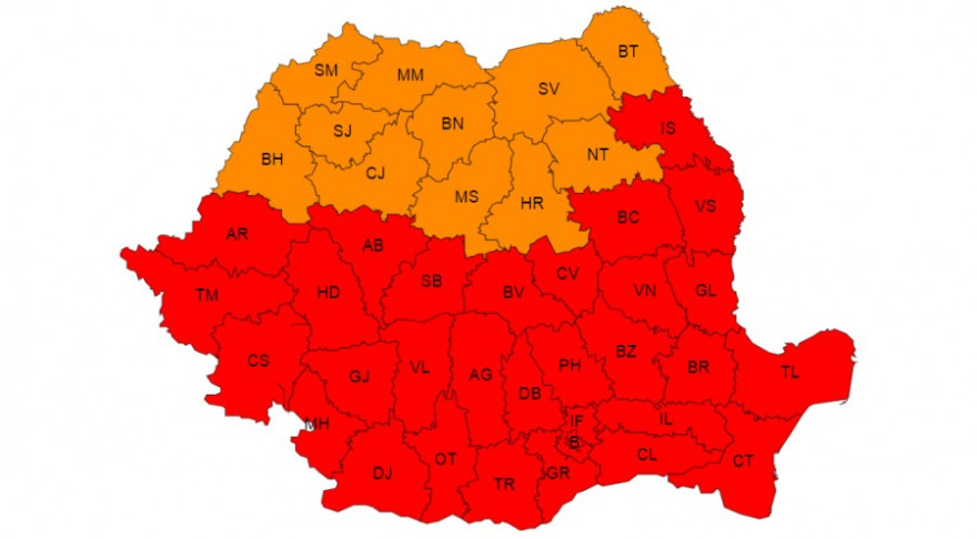 Az Országos Meteorológiai Szolgálat (ANM) hétfői közlése szerint hétfőn és kedden narancssárga riasztás van érvényben Máramarosban, illetve Erdély keleti és északkeleti részében, ahol a hőmérsékleti csúcsértékek 33 és 37 Celsius-fok között alakulnak, a hőmérséklet-páratartalom mutató meghaladja a kritikus 80-as szintet.