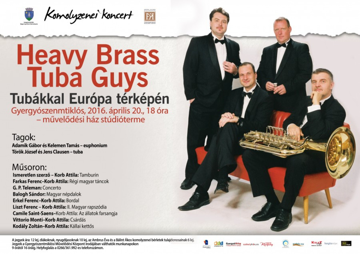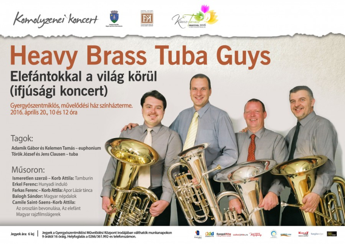 A magyarországi Heavy Brass Tuba Guys két koncertet is ad Gyergyószentmiklóson a Klassz–Tavasz Fesztivál keretében április 20-án, szerdán. 10:00 illetve 12:00 órától ifjúsági koncertre várjuk a diákokat a művelődési ház színháztermébe. Az Elefántokkal a világ körül címet viselő koncerten megismerkedhetünk az euphóniummal és a tubávanl. Délután 18:00 órától a komolyzenét kedvelő közönséget várjuk a művelődési ház stúdiótermébe. A koncert címe: Tubákkal Európa térképén.