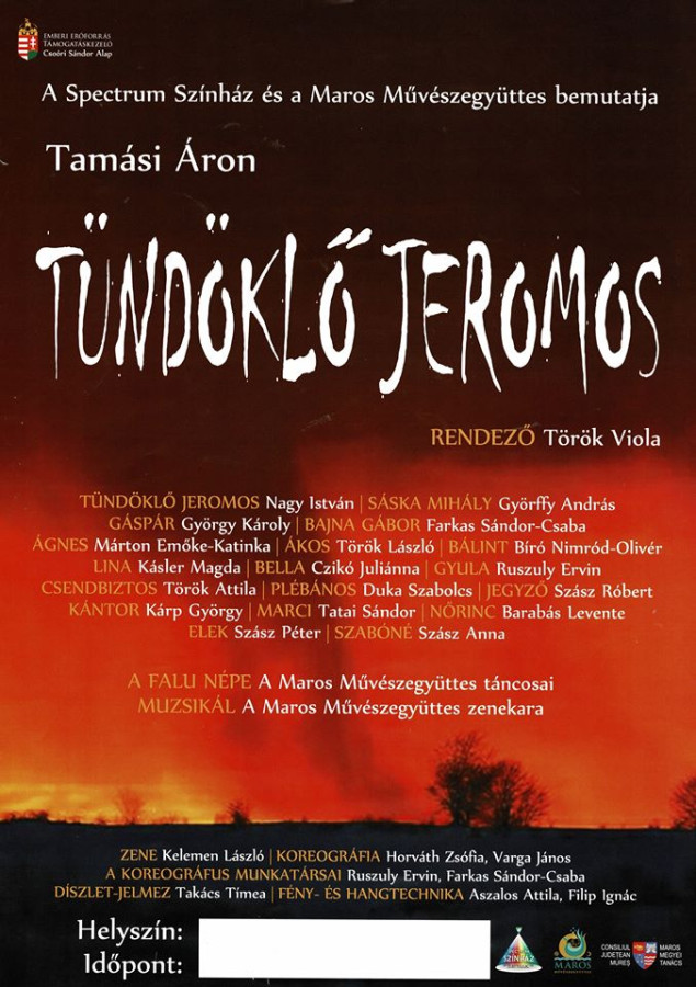 „A Tündöklő Jeromos című drámai játék egy egész közösség Megváltót váró keserűségét és reményeit, valamint a várakozásra hamis választ adó Jeromos történetét jeleníti meg. Tamási rituális színháza az adventi időszakot idézi: a sötétségből a fény várásának, a régi rosszal való szembesülésnek és lezárásnak, valamint a jobb új év reményének és elhatározásának idejét.