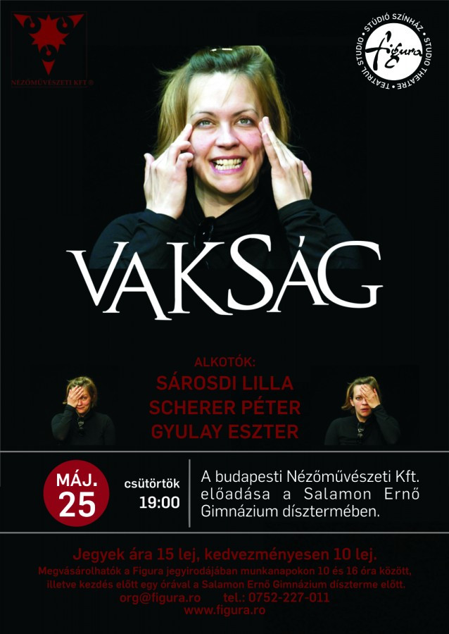 Újra Gyergyószentmiklósra érkezik a budapesti Nézőművészeti Kft., ezúttal Scherer Péter rendezésében a Vakság című előadás kerül bemutatásra május 25-én, csütörtök este 7 órától a Salamon Ernő Gimnázium dísztermében. A társulatot már ismerheti lehet a közönség, hiszen nemrég a Kézmosás fontossága, azelőtt A gyáva és az Ady/Petőfi című előadások kerültek műsorra a Figuránál. A Vakság című produkciót Sárosdi Lilla sok fesztiválon és középiskolában játszotta már 2012 óta.