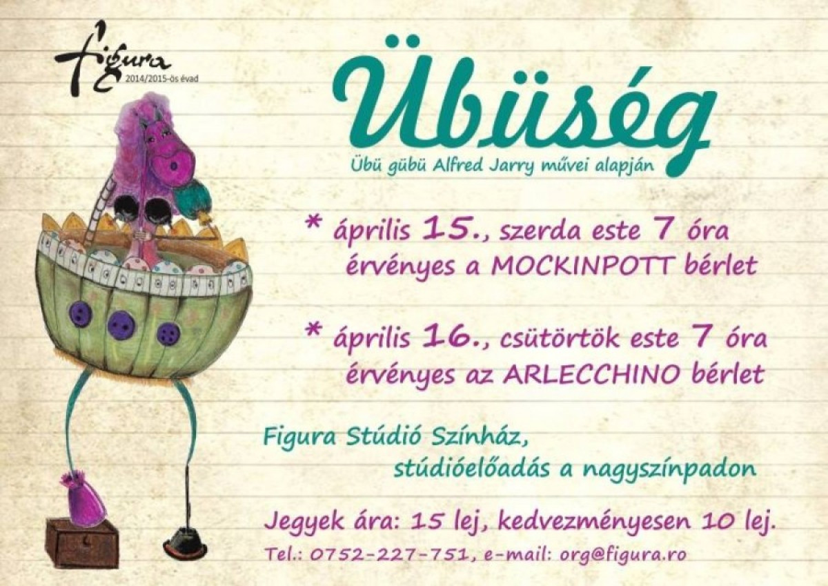 Április 15-én, szerdán este 7 órától a Mockinpott-bérlettel, április 16-án, csütörtök este 7 órától az Arlecchino bérlettel tekinthető meg Márkó Eszter rendezésében az Übüség, mely a Figura Alfred Jarry-szövegek nyomán készült produkciója.