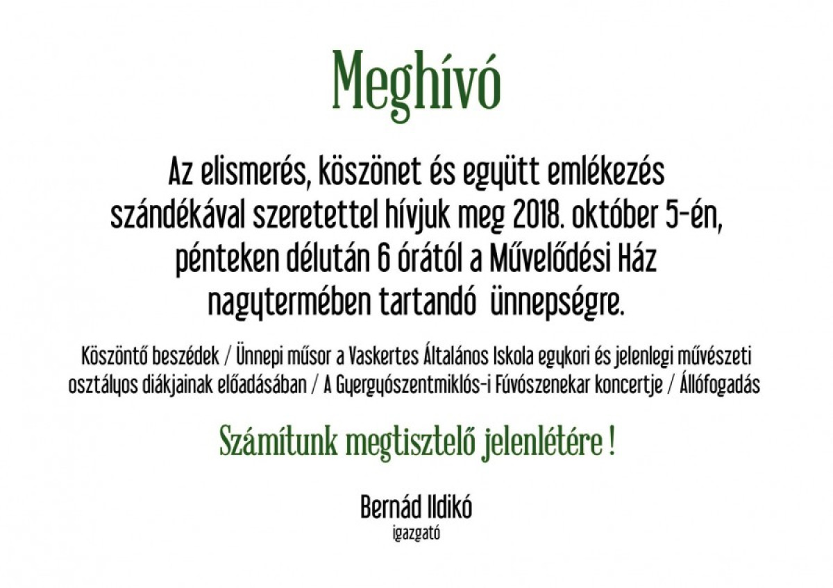 Az elismerés, köszönet és együtt emlékezés szándékával hívjuk meg városunk aktív és nyugdíjas pedagógusait, valamint egykori diákjainkat 2018. október 5-én, pénteken 18 órától a művelődési ház nagytermében tartandó ünnepségre.