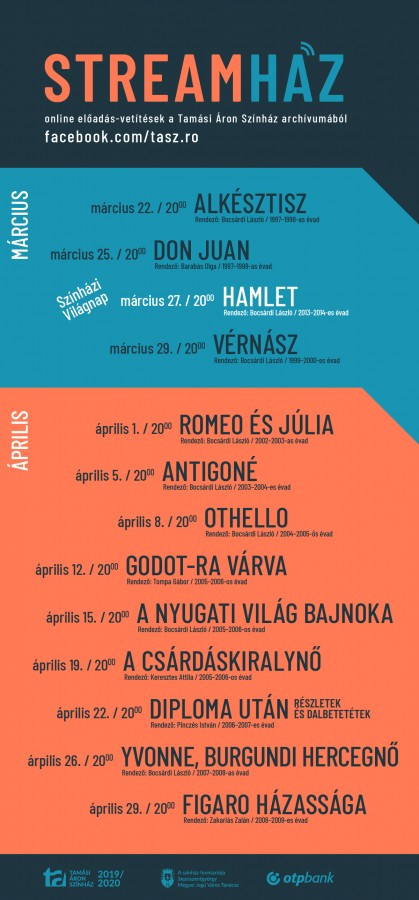 Egyre nyilvánvalóbbá válik számunkra, hogy a járvány miatti intézkedések hosszú távon is hatással lesznek az életünkre, és hogy ebben a helyzetben mindnyájunknak meg kell találni a működőképes kommunikáció új formáit. A „válságrepertoár” összeállítása és levetítése a Tamási Áron Színház első válaszlépése az intézmény működésének ideiglenes felfüggesztésére, melyet további izgalmas online akciók követnek majd. Bízunk benne, hogy bár személyesen nem találkozhatunk, a színházunk által kínált új élményekben is örömét leli majd a közönség.
