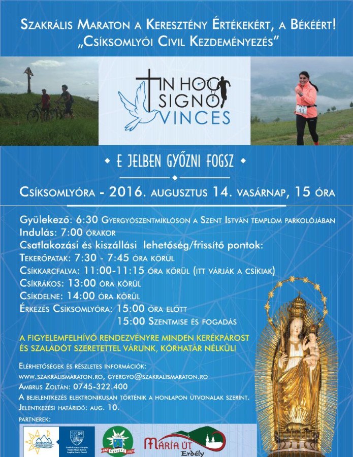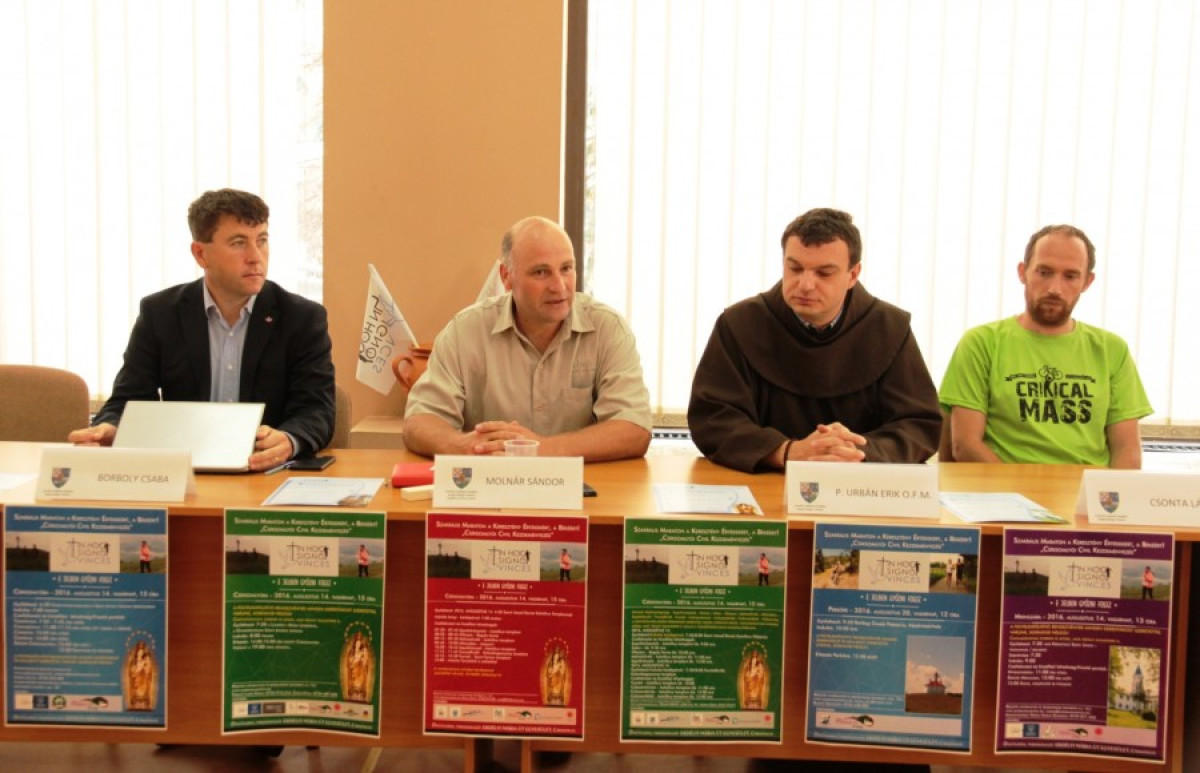 Augusztus 14-én, vasárnap zajlik a Szakrális Maraton a Keresztény Értékekért, a Békékért! csíksomlyói civil kezdeményezés. A kerékpárosok és szaladók több útvonalon haladnak Hargita, Kovászna, Maros, Brassó és Szatmár megyében. A rendezvény célja az egészséges életmód népszerűsítése, amelyhez a sport mellett a kiegyensúlyozott lelki életre is szükség van, hangzott el a csíkszeredai megyeházán szerdán, augusztus 10-én megtartott sajtótájékoztatón. Az első szakrális maratont a szervezők és a partnerek ismertették: Molnár Sándor, az Erdélyi Mária Út Egyesület és a Hargita Közösségi Fejlesztési Társulás munkatársa, Borboly Csaba, Hargita Megye Tanácsának elnöke, P. Urbán Erik OFM, a Csíksomlyói Kegytemplom igazgatója, Csonta László, a Zöld SzékelyFöld Egyesület elnöke, Karikás József, a csíkszeredai Siculus Alpin Klub Egyesület képviselője, Orbán József a kerékpárosok képviseletében, illetve Kovács Judit, aki Novák Eduárd csíkszeredai paralimpiai, világ- és Európa-bajnok kerékpározót, a megmozdulás egyik fővédnökét képviselte.