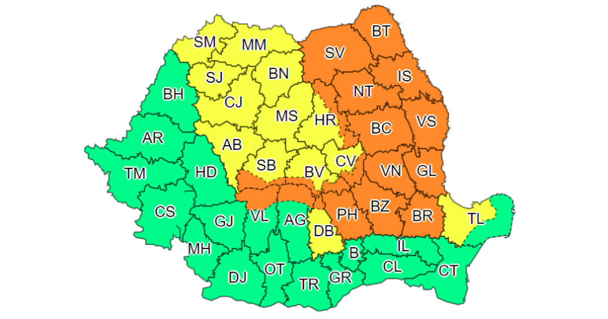 Ugyanakkor 10 és 23 óra között légköri instabilitásra vonatkozó, sárga jelzésű figyelmeztető előrejelzés van érvényben Erdély, Máramaros, Moldva egyes térségeiben, Muntenia és Dobrudzsa északi részében, illetve helyenként hegyvidéken. A jelzett időszakban az érintett régiókban villámlásoktól kísért heves széllökésekre és szélviharokra, helyenként felhőszakadásokra, elszigetelten pedig jégesőre is számítani lehet.