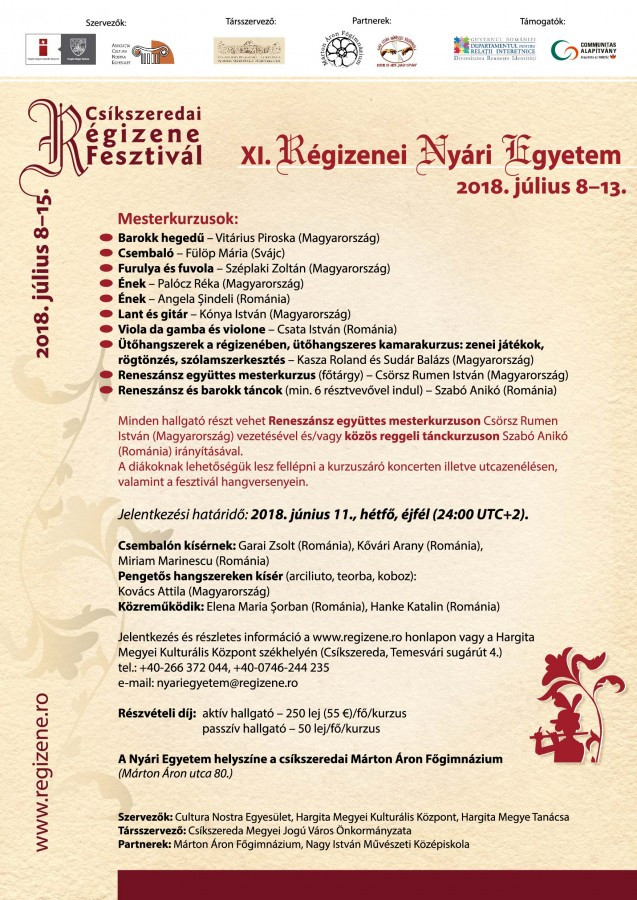Idén július 8–13. között tizenegyedik alkalommal szervezi meg Csíkszeredában a Hargita Megyei Kulturális Központ, Hargita Megye Tanácsa és a Cultura Nostra Egyesület a Régizenei Nyári Egyetemet. Hat nap alatt a résztvevők neves magyarországi, svájci és hazai tanárok irányításával mélyíthetik el tudásukat a reneszánsz és barokk zene historikus előadásmódjában, különös figyelmet szentelve a Régizene Fesztivál idei témájának, a spanyol régizenének.