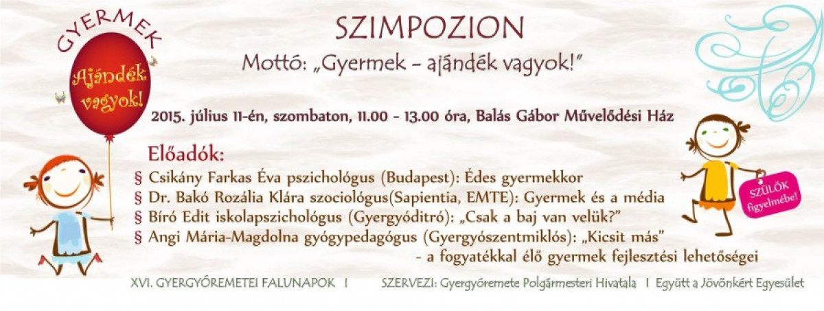 11:00 – 13:00 –GYERMEK: „Ajándék vagyok!” – szimpozion – Balás Gábor Művelődési Ház