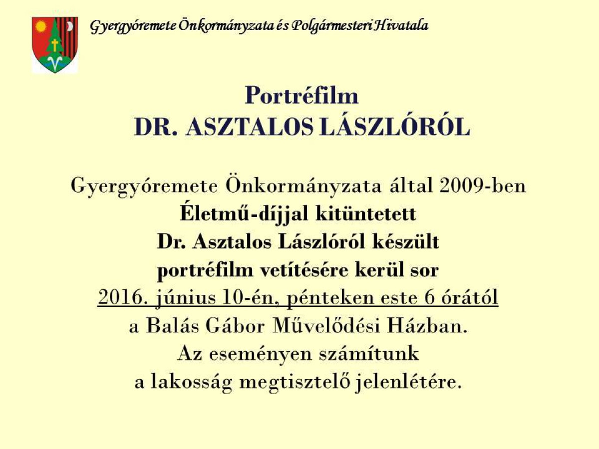 12:30 – FILMVETÍTÉS – DR. ASZTALOS LÁSZLÓ PORTRÉFILMJE – Balás Gábor Művelődési Ház