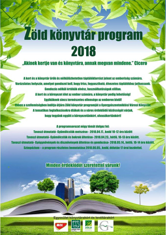 A rendezvénysorozat utolsó programjaként szeretettel meghívjuk 2018. június 5-én, kedden 17 órai kezdettel a Gyergyószentmiklósi Városi Könyvtár udvarára (rossz idő esetén a díszterembe), hogy tegyünk együtt a környezetünkért, olvasókertünkért!